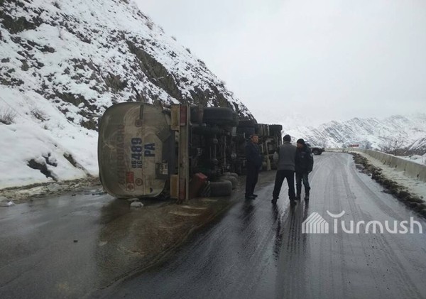 Фото — Бишкек—Ош жолунда 35 тонна солярка ташып бараткан унаа оодарылып, 1 адам жабыркады