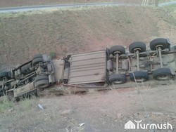 Фото - Ош—Бишкек жолунда күйүүчү май ташыган унаа оодарылып кетти