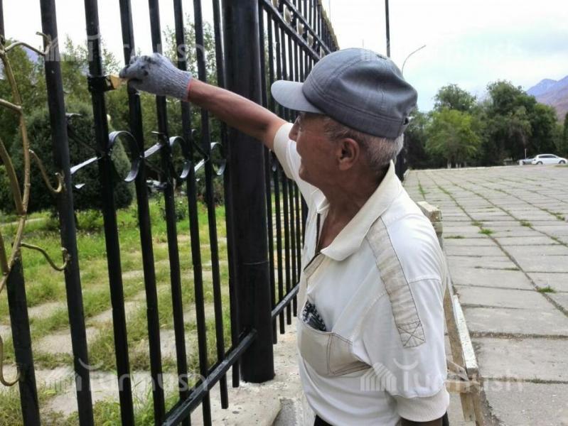 Житель города Кара-Куль несмотря на маленькую заработную плату работает в секторе по озеленению и благоустройству при городском МП (фото)